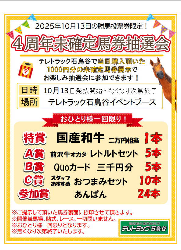 皆様のおかげをもちまして当場も4周年を迎えることができました。 ありがとうございます。 10月13日(祝月)に日頃の感謝を込めまして、豪華賞品が当たる抽選会を行います。 皆様のご来場お待ちしております。