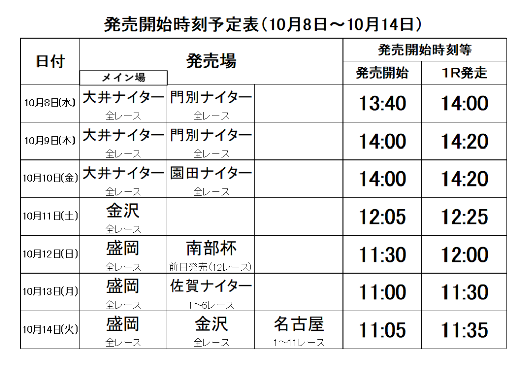 10月1日(水)~10月7日(火)の発売時刻予定