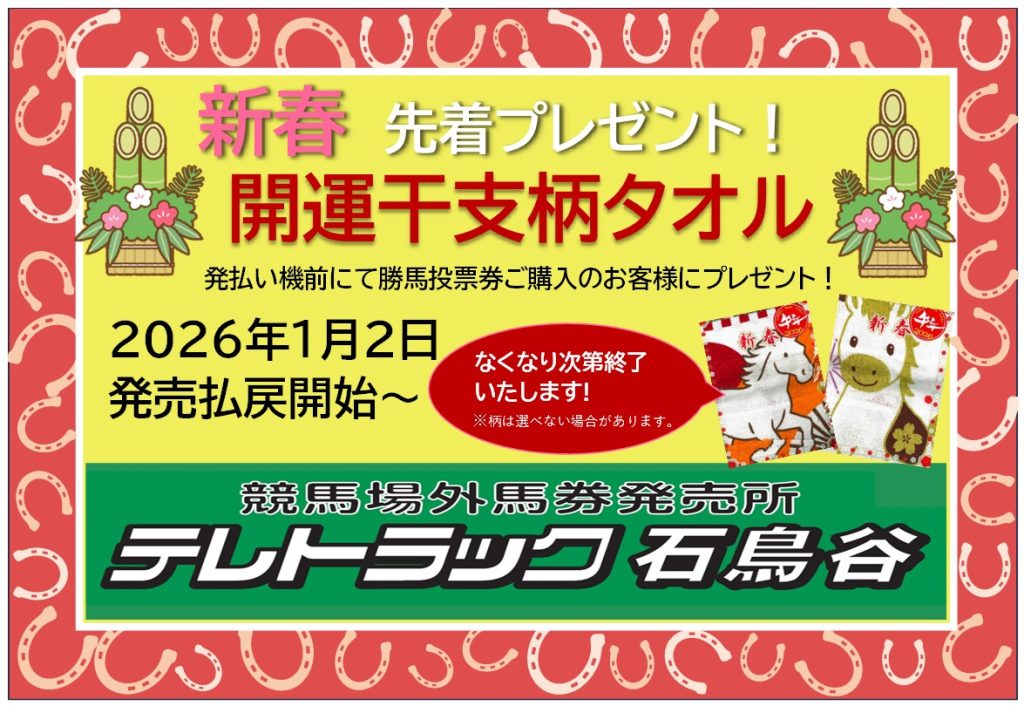 競馬ファンの皆様こんにちは!! 新春イベントといたしまして勝馬投票券ご購入のお客様に毎年恒例「開運 干支柄タオル」をプレゼントいたします。 なくなり次第終了いたしますのでお早目のご来場をお待ちしております。