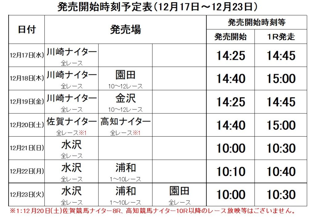 12月24日(水)~12月30日(火)の発売時刻予定