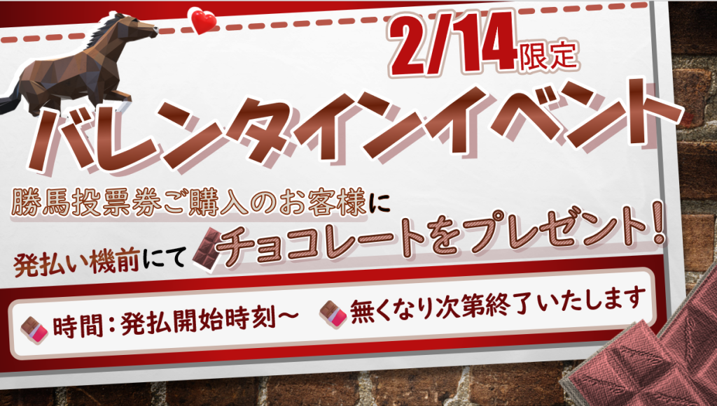 競馬ファンの皆様こんにちは!! 2/14にバレンタインイベントといたしまして、勝馬投票券ご購入のお客様にちょこっとしたチョコレートをプレゼントいたします。 なくなり次第終了いたしますのでお早目のご来場をお待ちしております。
